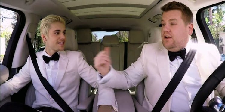 Things I never knew I needed: Justin Bieber and James Corden in matching white suits and bowties yelling along to "Uptown Funk."