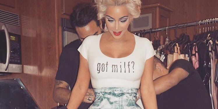 Kim's glam squad, led by stylist B. Akerlund, outfitted the starlet in a white "Got Milf?" shirt, vintage blue denim shorts and knee-high boots.