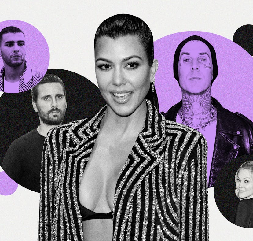 If it seemed like Kourtney Kardashian and Travis Barker fell in love at lightning speed, well, it's because they did. The pair first sparked romance rumors in January 2021 after they posted matching Instagram Stories from a vacation in Palm Springs. Soon after, they made their romance IG official. By February 16, Kardashian posted a photo holding Barker's hand, and there was no mistaking what it meant: They were getting serious. Fans realized just how intertwined they were two months later when Barker took the ultimate leap of faith and got Kardashian’s first name tattooed on his chest. It's been the ultimate whirlwind Hollywood romance, but Kourtney Kardashian and Travis Barker's drama with their exes proves it hasn't lacked bumps in the road.
