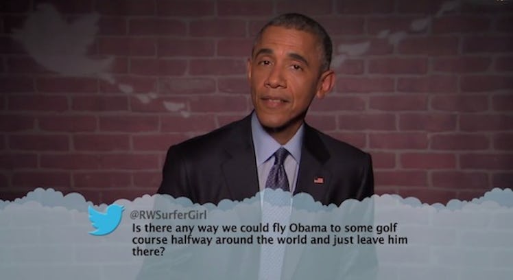 On an episode of "Jimmy Kimmel Live!" last night, President Barack Obama decided to poke fun at himself in a hilarious segment of "Mean Tweets." From his big ears, to his jeans, to his nonchalant attitude, the POTUS reading some hilarious tweets was far more entertaining than the typical State Of The Union address.