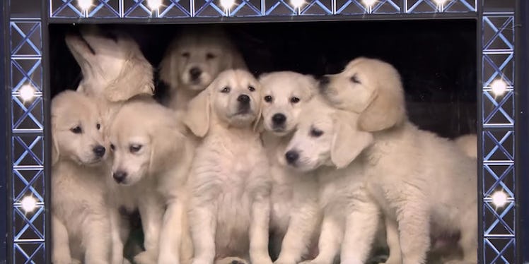 "This works every year," said Fallon. After releasing the gates, the puppies charged down the ramp and mobbed the Denver Broncos bowl.