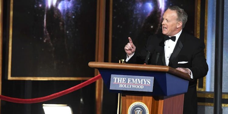 All in all, the 69th Primetime Emmy Awards was a pretty good Emmys. Stephen Colbert didn't make a single racially insensitive joke, Lena Waithe gave an incredibly inspiring acceptance speech, the gay episode of Black Mirror won twice, and there was not a Modern Family win in sight. But there was one dark cloud over the evening: the surprise, supposedly comedic appearance by disgraced former press secretary Sean Spicer. Judging by the Sean Spicer Emmy reactions on Twitter, viewers were not pleased to see this angry little man joking around with his pal Stephen Colbert on their television screen.