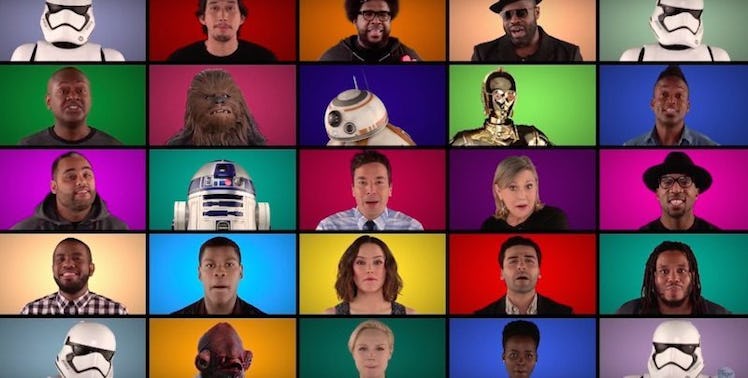 Harrison Ford, Carrie Fisher, Daisy Ridley, John Boyega, Lupita Nyong'o, Oscar Isaac, Adam Driver and Gwendoline Christie joined Fallon and The Roots for a “The Brady Bunch”-style sing-off.