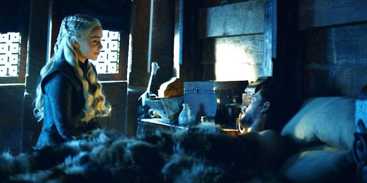 After successfully (at least, to their knowledge) brokering a deal with Cersei Lannister to march north together against the White Walkers, Jon and Dany celebrate with a little bedroom magic. But in a kind of sick twist, at the same time as the sex scene unfolds, Bran sees the truth about Jon Snow's parentage... which makes Dany Jon's aunt. Twitter was quick to react with a ton of jokes about the unbeknownst incestuous hookup.
