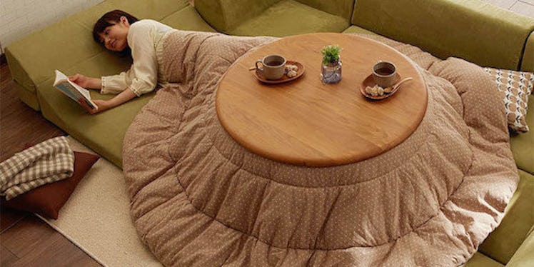 It's called a kotatsu, and it consists of a massive, super-warm blanket sandwiched between a low-sitting table frame and a square-shaped tabletop. According to BoredPanda, a kotatsu helps address the problem of little insulation in the average Japanese home.