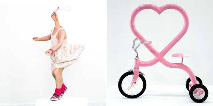 The series features a variety of tricycles twisted into odd creations along with human hands protruding through white walls and fiberglass figures that swap out heads for hands blowing bubbles.
