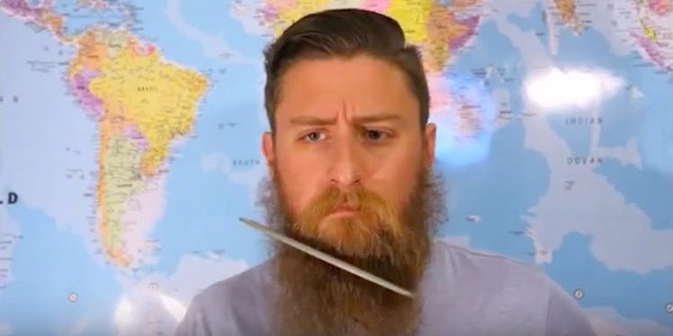 After using the same process to peel a lemon, his facial hair starts to get a bit feisty and begins twisting itself into all sorts of hilarious braided styles before this guy finally has enough and grooms his bushy beard back into shape.