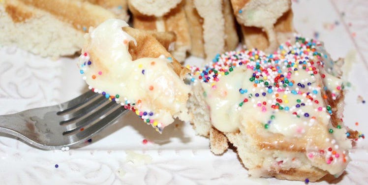 It's such a fun take on the classic birthday cake. Plus, it's way easier to make than an actual cake. All you need is a waffle iron and a handful of ingredients, many of which you probably already have in your refrigerator.
