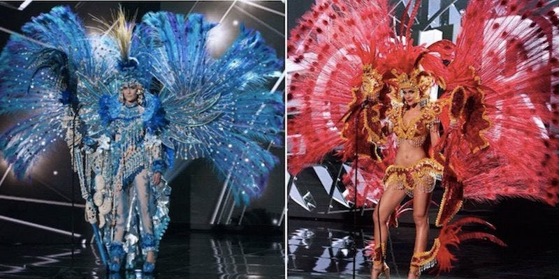 Aside from lots of glitter, sequins and feathers, each contestant's costume incorporated elements from her home country into her design, and I have to say while all of these costumes were beautiful, some were definitely... interesting, to say the least.