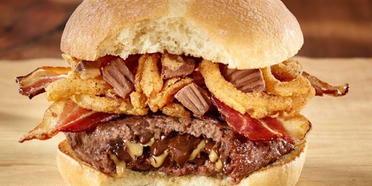 In addition to the Reese's stuffed beef patty, this meaty monstrosity also has fried onion rings, bacon and some crumbled Reese's on top.