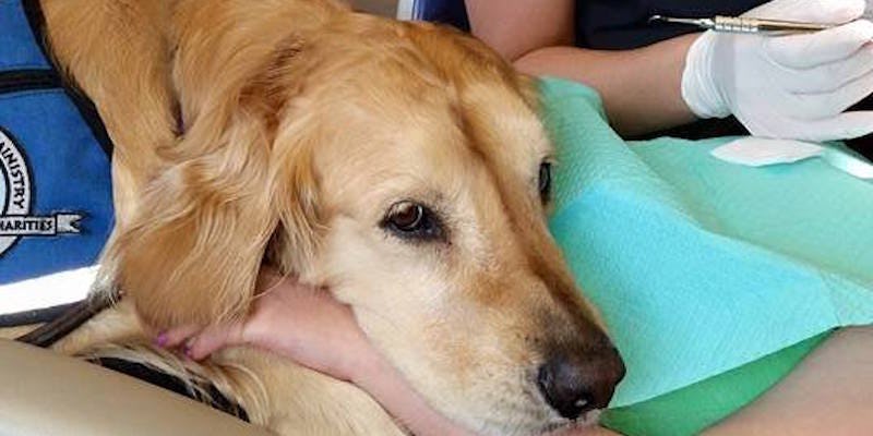 JoJo isn't your average dental nurse. She's actually a 6-year-old golden retriever and trained comfort dog who works alongside Dr. Paul Egger and Dr. Thomas Resnick as a doggy dental nurse at the Pediatric Dentistry of Northbrook in Illinois.