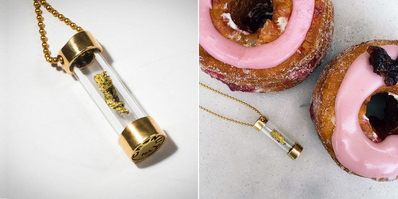 This delicious necklace is essentially a gold-covered flake of the almighty Cronut tucked inside a glass vial for all the world to see.