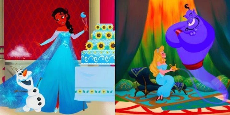 His drawings include everything from Elsa as a mermaid and Belle as Sleeping Beauty to Jasmine serenading a bird in the forest and Ariel making a mad dash from the ball at midnight.