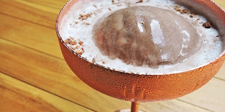 The Single Scoop Sip is made with a single scoop of freshly churned ice cream, dark rum, Kahlua, and Irish Cream. It's served in a frosted martini glass.