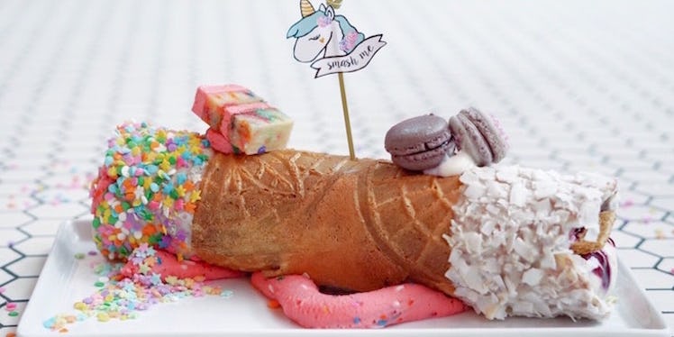 The unicornolli comes with a unique utensil — a mini hammer — with a label that says "smash me," so you can let out all your pent-up anger, making you feel tough and powerful before inhaling your colorful treat.