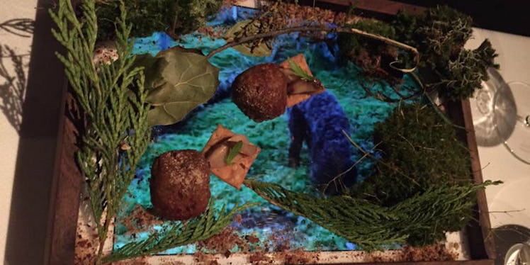 "White truffle croquettes on iPads playing videos of water dogs on the truffle-hunt" sounds fake, but OK.