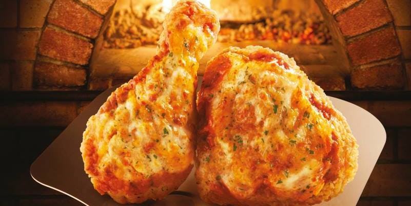 That's right. You can now eat pizza and wings with just one bite because Napoli Crispy Pizza Chicken is a real thing, and it looks delicious.