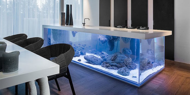 Thanks to its clever design, you can raise the countertop with the simple push of a button to gain access to the aquarium for all those times you want to clean the tank or simply grab a fish for dinner. Whichever floats your boat.
