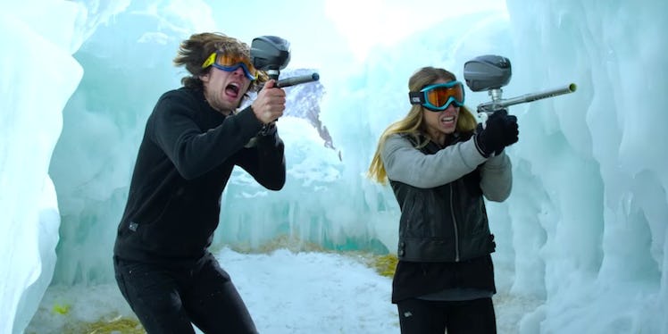 In a recent video uploaded to YouTube by videographer Devin Super Tramp, we're taken to an icy terrain where two paintball gun-equipped lovers defend themselves against a group of evil intruders.