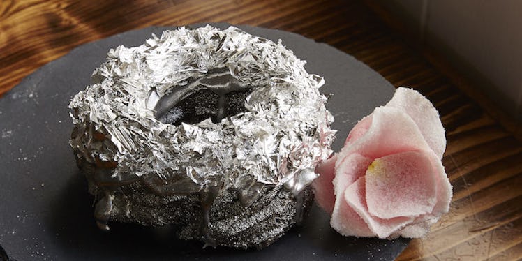 According to a press release, each treat is "a rose petal doughnut filled with cream and a spicy ginger-jalapeño margarita jelly, covered in a sweet tequila frosting and then finally topped off with sheets of edible silver and platinum."