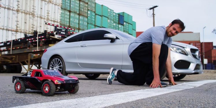 Well, there's a first time for everything! In a recent video uploaded to YouTube by videographer Devin Super Tramp, we're introduced to an obscure matchup featuring a brand new Mercedes-Benz coupe, a parkour expert and a toy car.