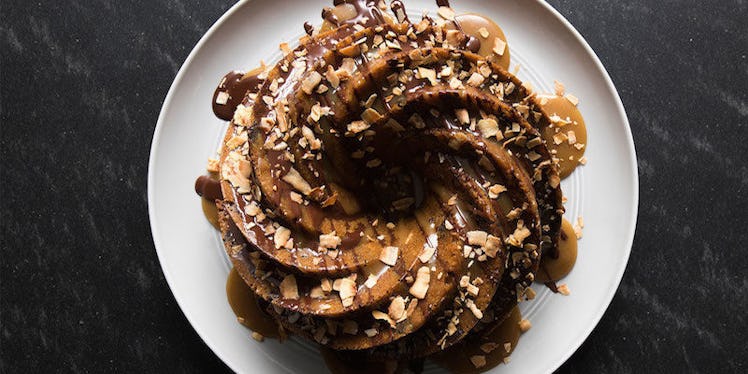 So, we created a giant Bundt cake version of Samoas, which takes a boring old Bundt cake and gives it a makeover inspired by your beloved Girl Scout Cookies.