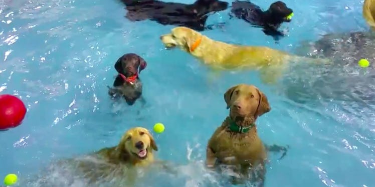 In a recent video uploaded to Facebook by Virginia-based doggy daycare Happy Tails Resort, we're given a rare peek into a jumpin' doggy pool party. I mean, it is going down and every dog in sight is raging like a true party animal -- expect for one...