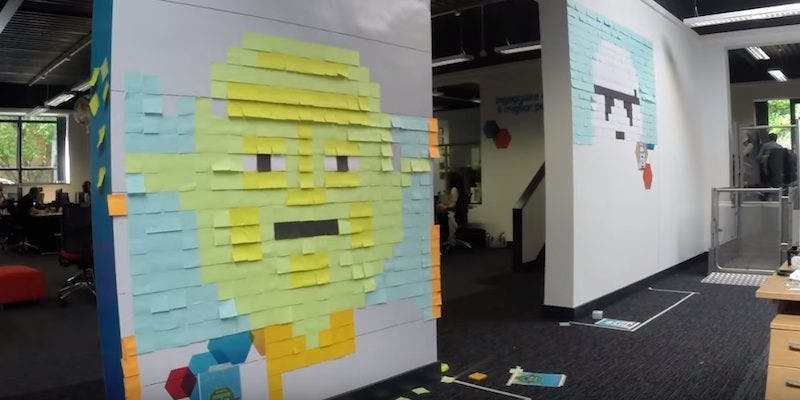 It took four employees five hours to completely cover the office's dividing walls in 3,597 Post-it notes, and their hard work clearly paid off because these murals look incredible.
