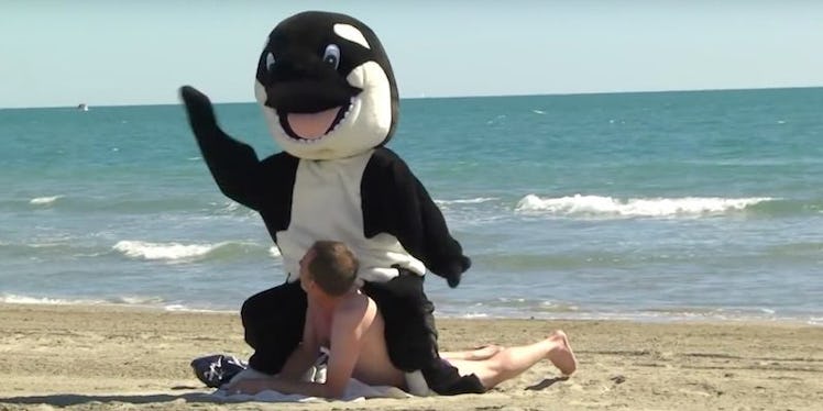 In Gaillard's video, whales ride untrained humans on the shore, and dolphins film grocery shoppers, detailing the horrors of bizarro SeaWorld.