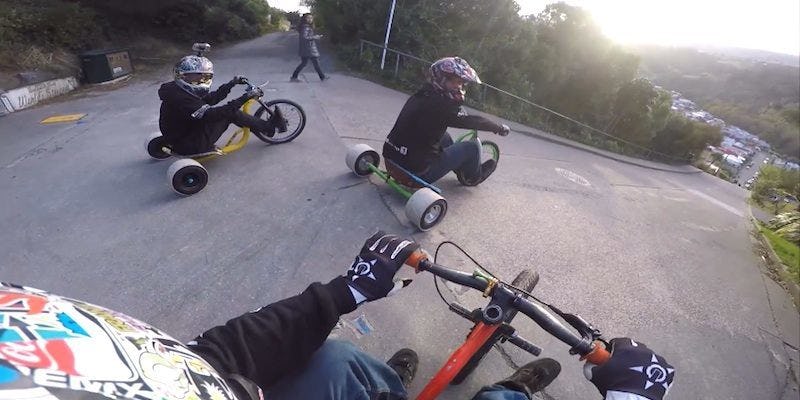 Recently, these drift tricycle enthusiasts strapped on GoPros and made their way to Baldwin Street in New Zealand so they could take on the "steepest street in the world."