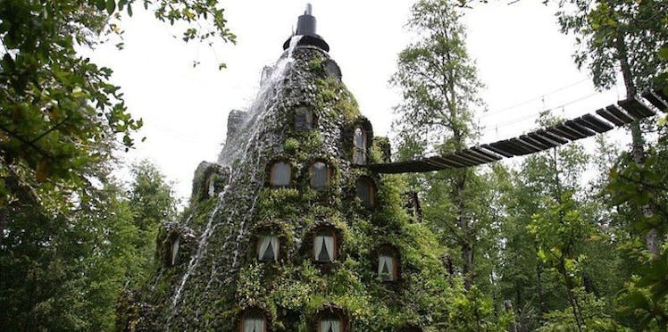 The Montaña Mágica (Magic Mountain) Lodge is an adventure unlike any other, boasting a swinging bridge entrance and a waterfall pouring from its roof.