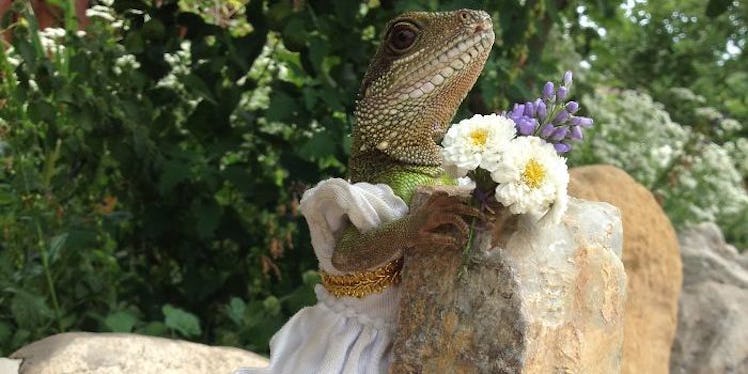 There's a slight chance you've never seen a lizard in a wedding dress before.