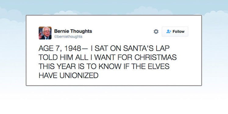Want to read the imaginary ramblings typed in all caps from a slightly eccentric politician on the other side of the aisle? Look no further than @BernieThoughts, your one-stop shop for quotes you probably wouldn't be shocked to hear Bernie Sanders say in real life.