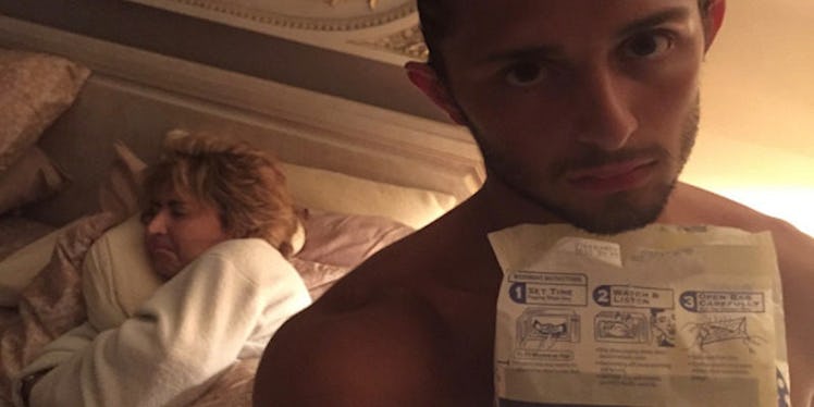 "I adore my mom beyond words but I have to mom-shame her for always doing this to me," Nick, a 20-year-old student from Lancaster, Pennsylvania, wrote alongside some photos of his snack-laden hands and snoring mother.