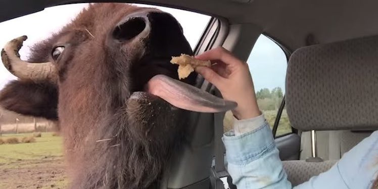 I like to imagine that entirely uncontroversial statement inspired at least one overly sensitive reader to angrily yell "Oh yeah? Prove it!" at her screen, and to counter, I present this video of a girl feeding a buffalo from a moving car.