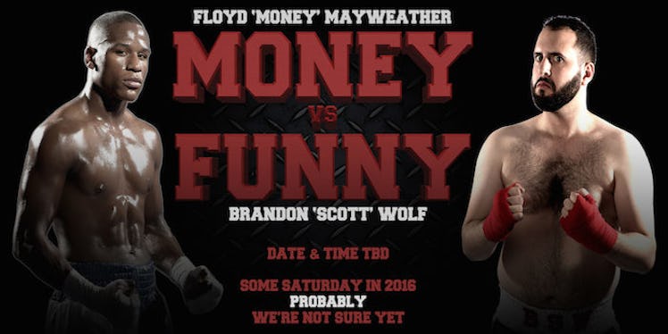 FightBrandonScottWolf.com is presented by DateBrandonScottWolf.com, so you could make the argument this new site is also geared toward getting the comedian a date: a date with destiny… OK, maybe not a date as much as a no-strings-attached hookup with Floyd Mayweather's fists.