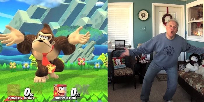 The animations this dad is imitating are the “taunts” you can do in Super Smash Bros. when you defeat your enemy.