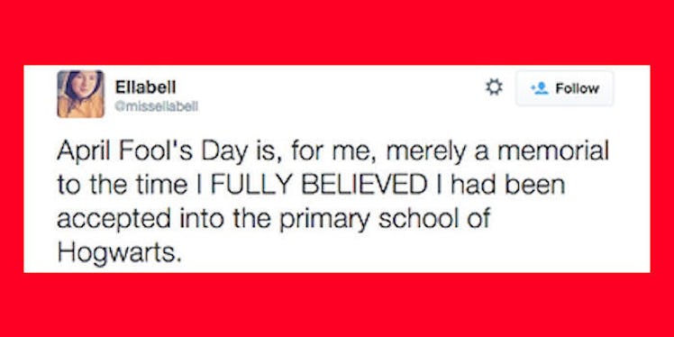 April Fool's Day is, for me, merely a memorial to the time I FULLY BELIEVED I had been accepted into the primary school of Hogwarts. — Ellabell (@missellabell) April 1, 2015