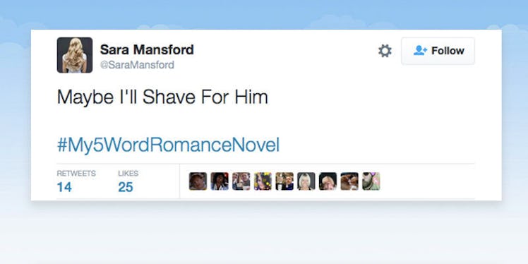 It wouldn't shock me if Twitter eventually became a hotbed for written erotica, but based on the tweets associated with the slightly contradictory #My5WordRomanceNovel, it's a much better venue for making fun of the medium.