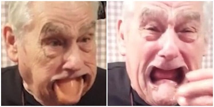 After seeing and recording this humorous event, one of this great-grandfather's supposed loved ones decided to post it on the internet so other people could laugh when their oldest relative's prosthetic food-chewers fall out.
