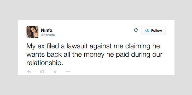 For example, after Blake Minto's relationship went south, he found a lawyer who was willing to sue his ex-girlfriend for a sum of $2,100 -- the amount he claims he spent during the course of their relationship: