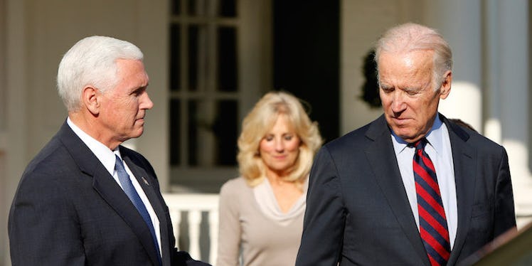 But in the midst of all this, Biden has to actually do his job — a job that includes being photographed meeting with Mike Pence and his wife and looking "friendly."
