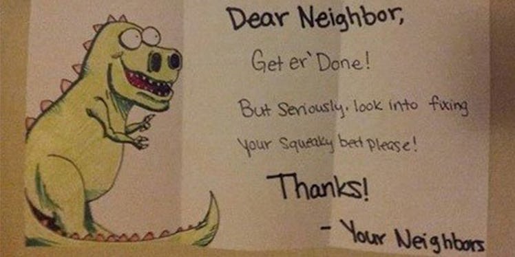 If you ever find yourself in this situation, there is one (and only one) solution: Leave a passive aggressive note on your neighbor's door. If you're not sure what to write, feel free to use these for guidance.