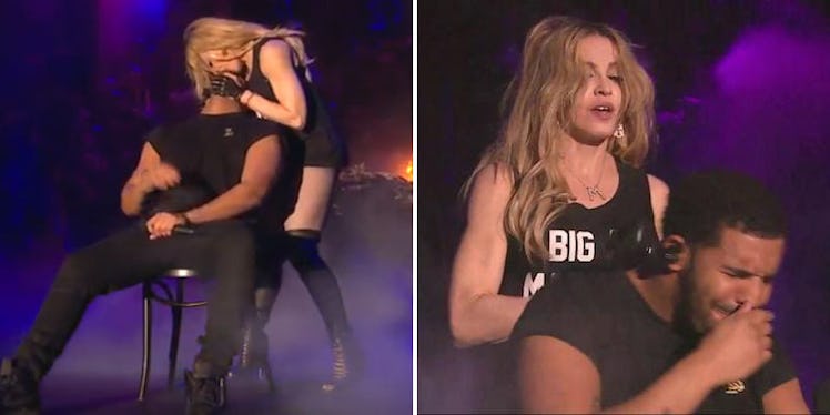 Drake and Madonna performed together at Coachella on Sunday night and during their set, Madonna made out with Drake onstage for a very, very long time.