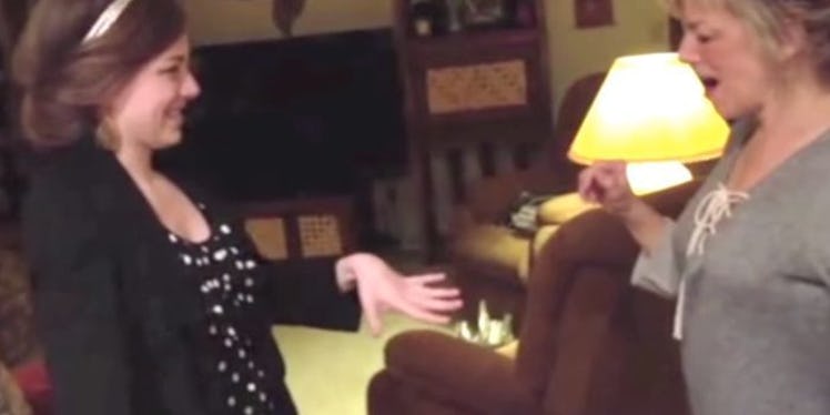 Finally, after almost 30 seconds of this, the mother sees the engagement ring and totally loses her sh*t. It's clear she's both surprised and elated by the news.