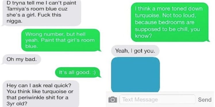 With one mistakenly sent text, two people came together to discuss whether or not to paint a little girl's room "that periwinkle sh*t."
