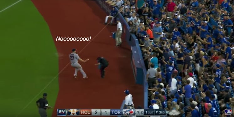 You're standing on the sidelines at a baseball game when you're suddenly knocked over by first baseman AJ Reed who is making a run for the ball as you eagerly try to get out of the way.