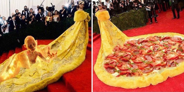 But, the big meme-splosion came from this pool/tarp-sized gown of mass destruction Rihanna dragged around.