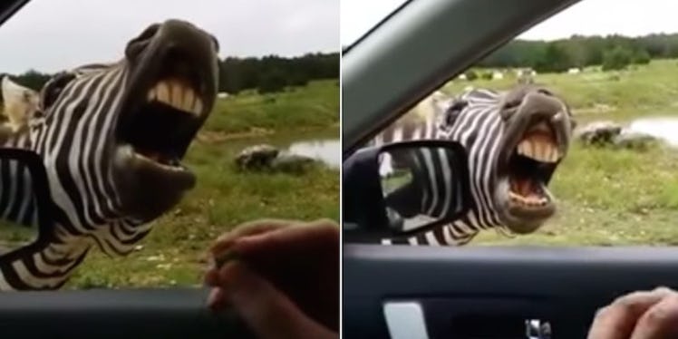 In the video up top, a zebra stands outside of a car window, accepting snacks from an unidentified person inside the vehicle.