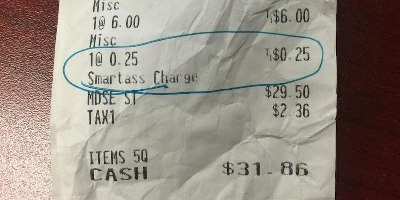 ... Like this guy, who was apparently a dickhead to someone who was serving him because he got an official "Smartass Charge" of 25 cents, as featured in this picture of his receipt.